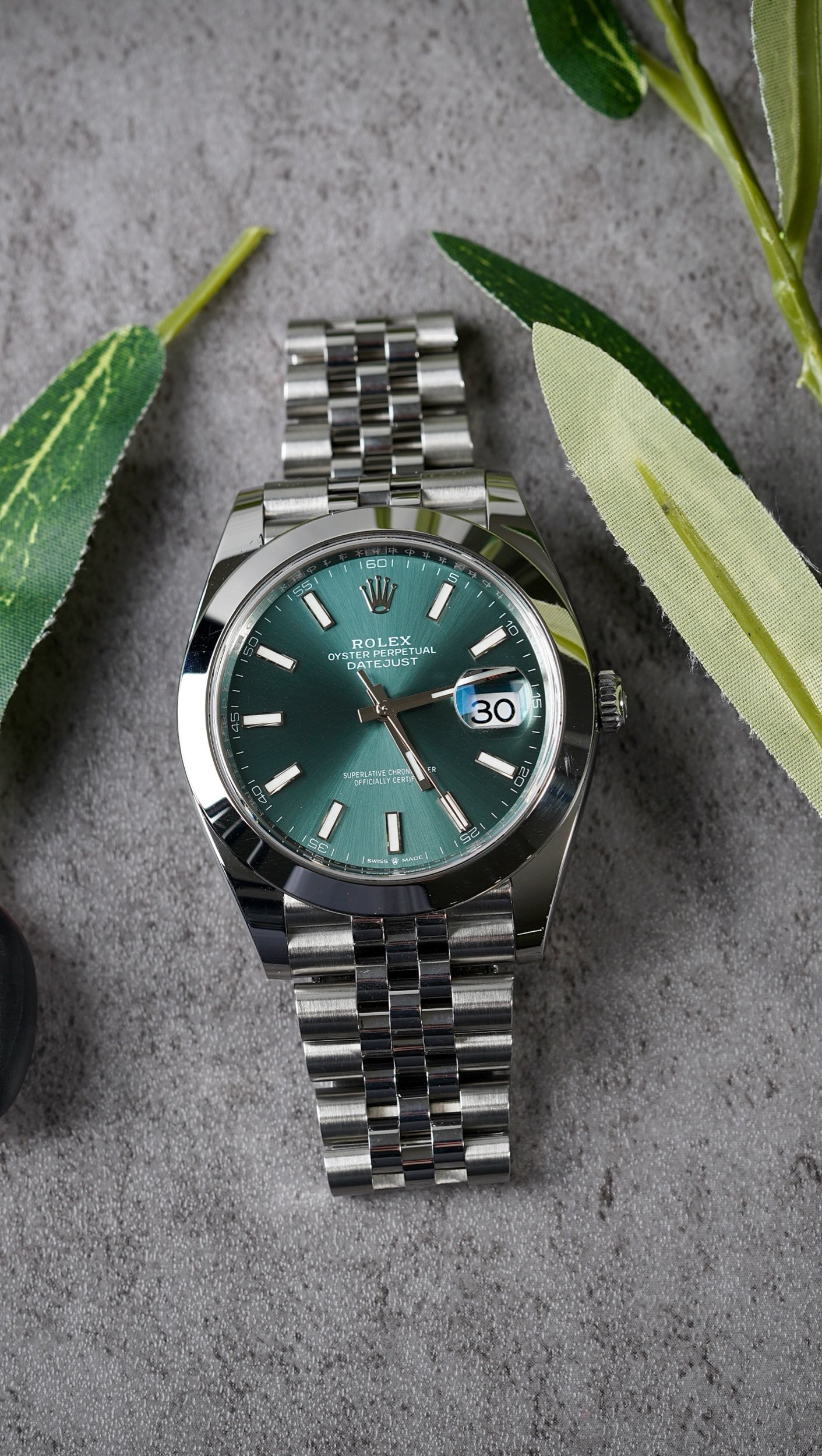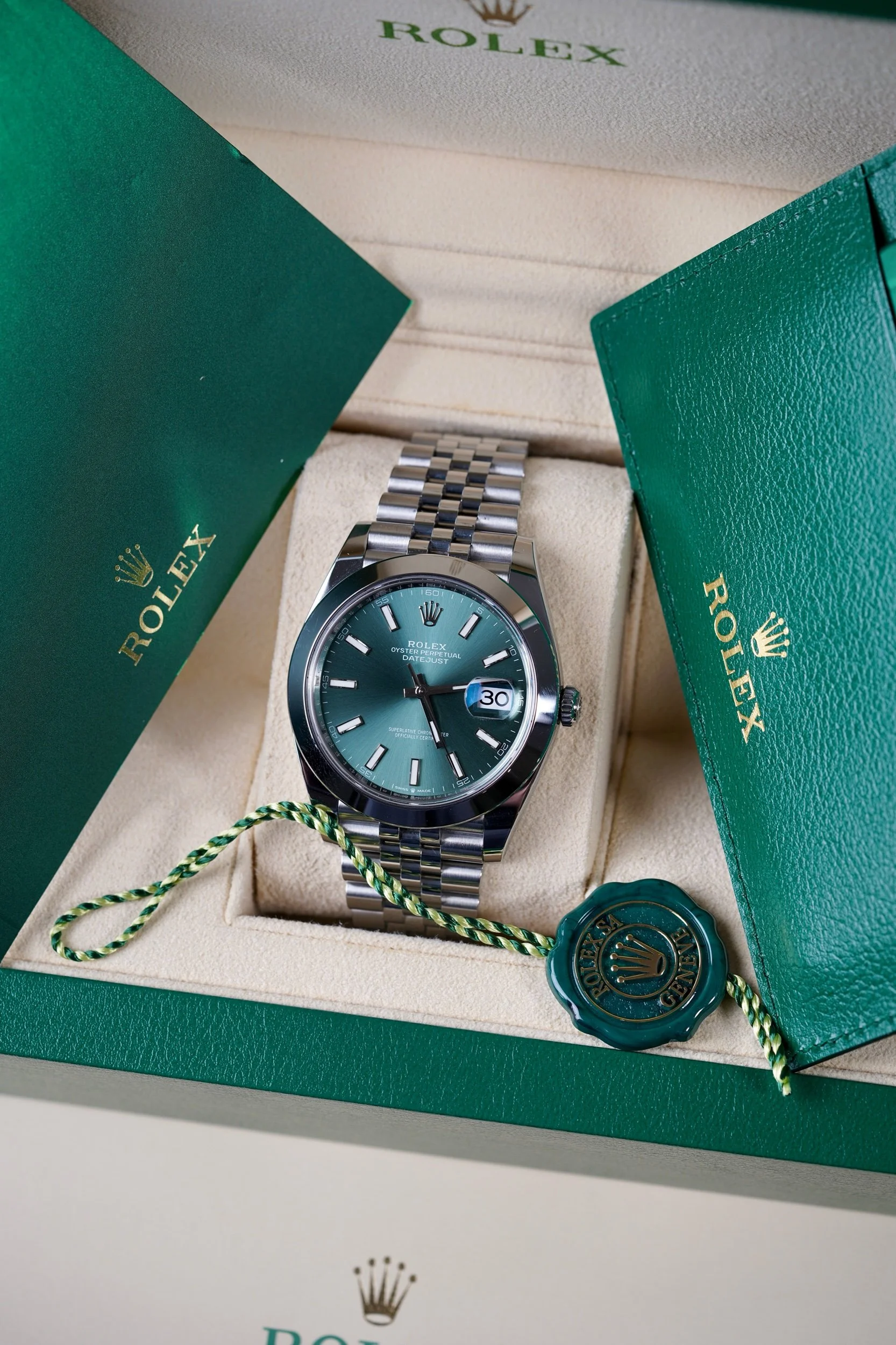 • Dial: Mint green dial with applied markers and signature Rolex date display